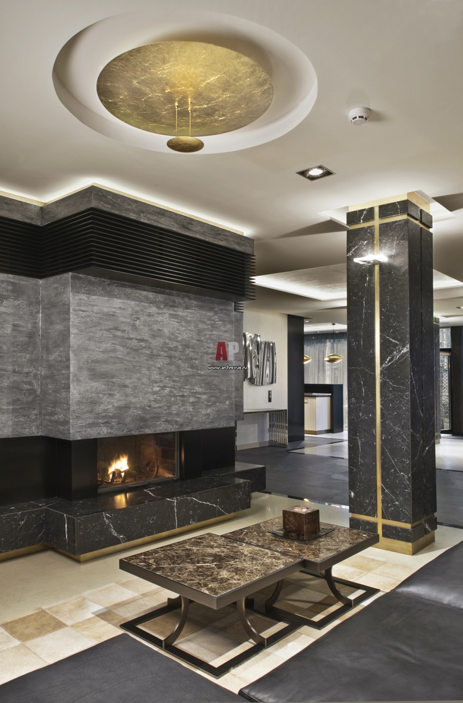 Диванная группа Baxter у камина. В отделке двухстороннего камина использован тот же мрамор, что и на колоннах, а также металл. Дымоход отделан декоративной штукатуркой серого цвета.