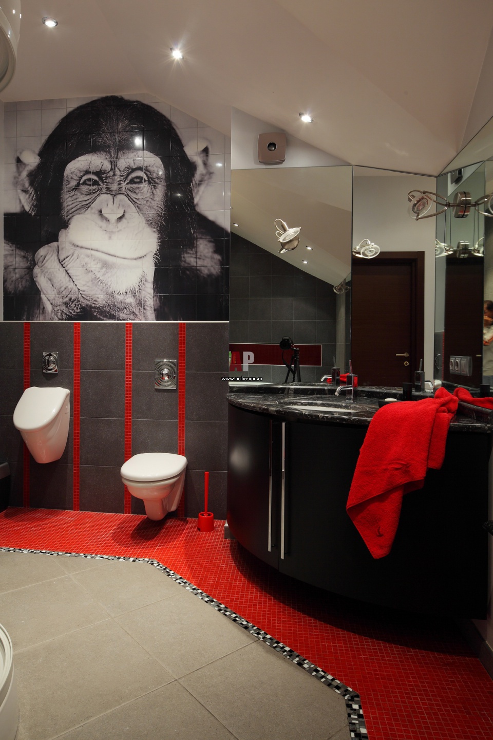 Санузел в черно-белой цветовой гамме с красными акцентами. На плитке изображен фотопринт обезьяны.