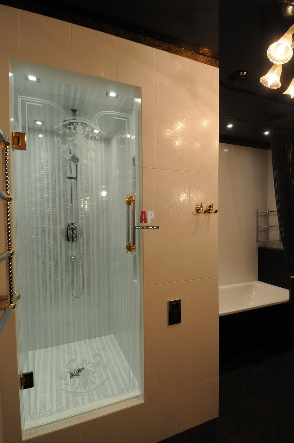 Стеклянные двери и зеркала украшены вензелями, созданными по эскизам авторов проекта и нанесенными пескоструйкой, поставщик «Этерна»