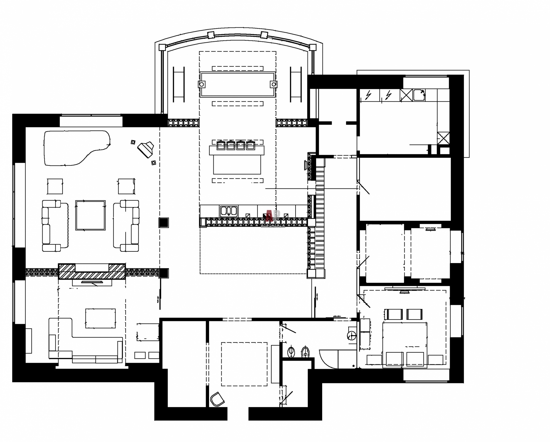 Планировка 2-х этажного частного дома в стиле ар-деко. Первый этаж