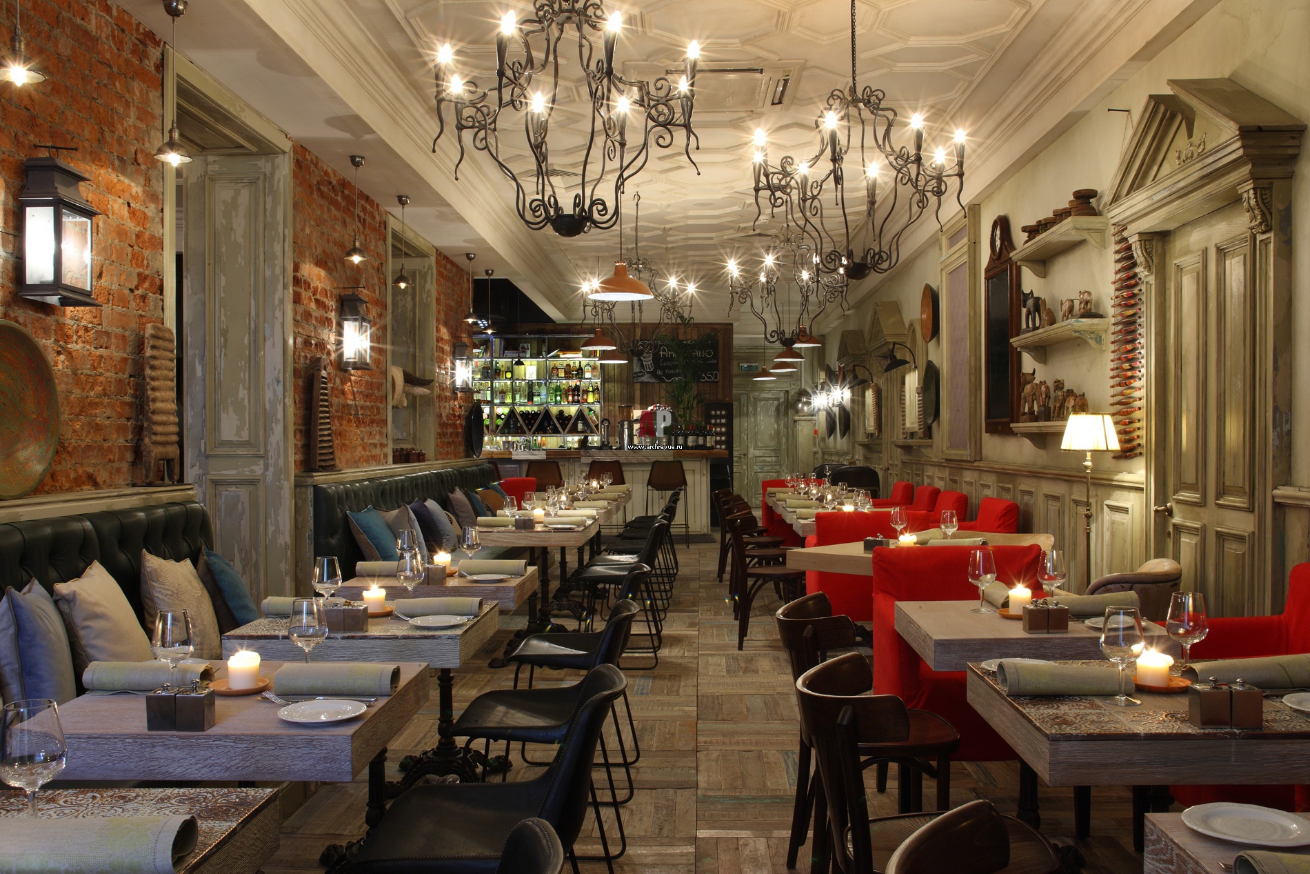 Основной зал ресторана домашней кухни. Кресла, столы, стулья, кованые светильники привезены ресторатором из разных стран мира.