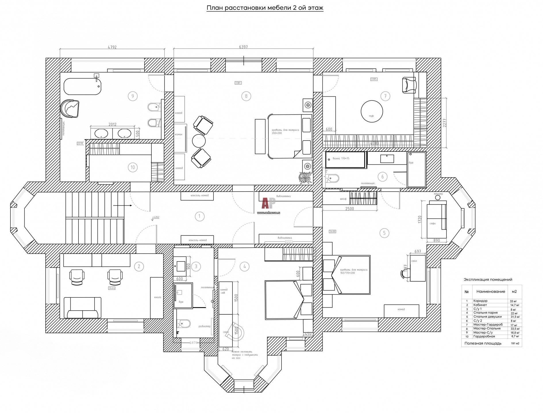 Планировка 2 этажа 3-х этажного дома в Подмосковье. Общая площадь - 650 кв. м.