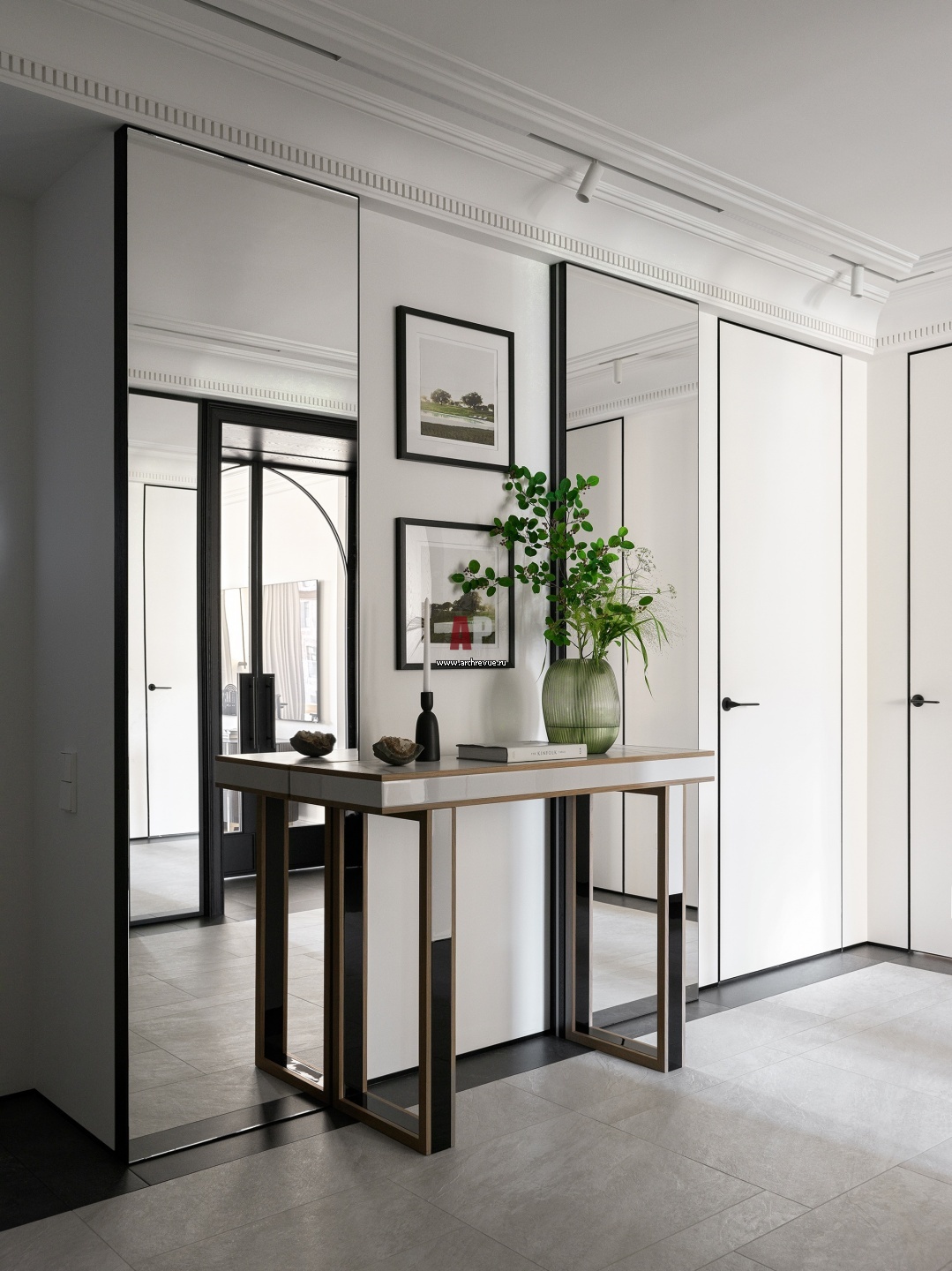 Квартира для семейных выходных. Интерьер прихожей. Консоль, пуфик, стеновые панели и портал с зеркальными шкафчиками, на заказ.