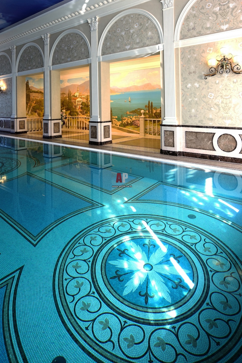 Бассейн в интерьере частного усадебного дома. Колоннада с арками и пилястрами, роспись стен поддерживают итальянскую тему.