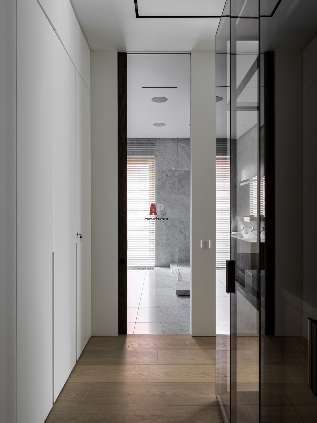 Блок хозяйских помещений: вид из гардеробной на ванную комнату. Стеклянная гардеробная витрина, Molteni &C.