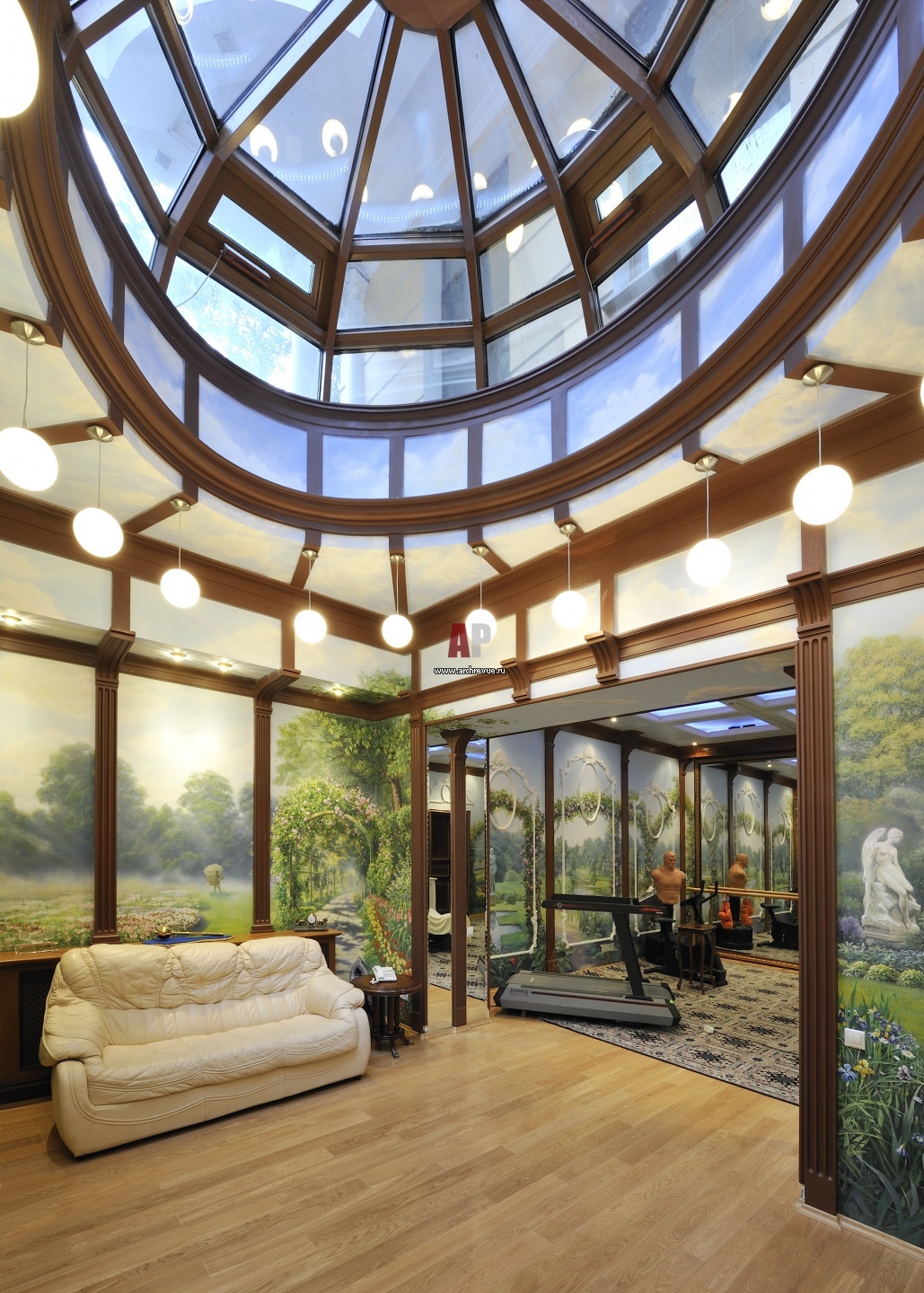 Фото интерьера тренажерного зала в парадном классическом особняке. Стены украшены фресками и зеркалами. Вместо глухого потолка – стеклянный фонарь, который впускает естественный свет в цокольный этаж.