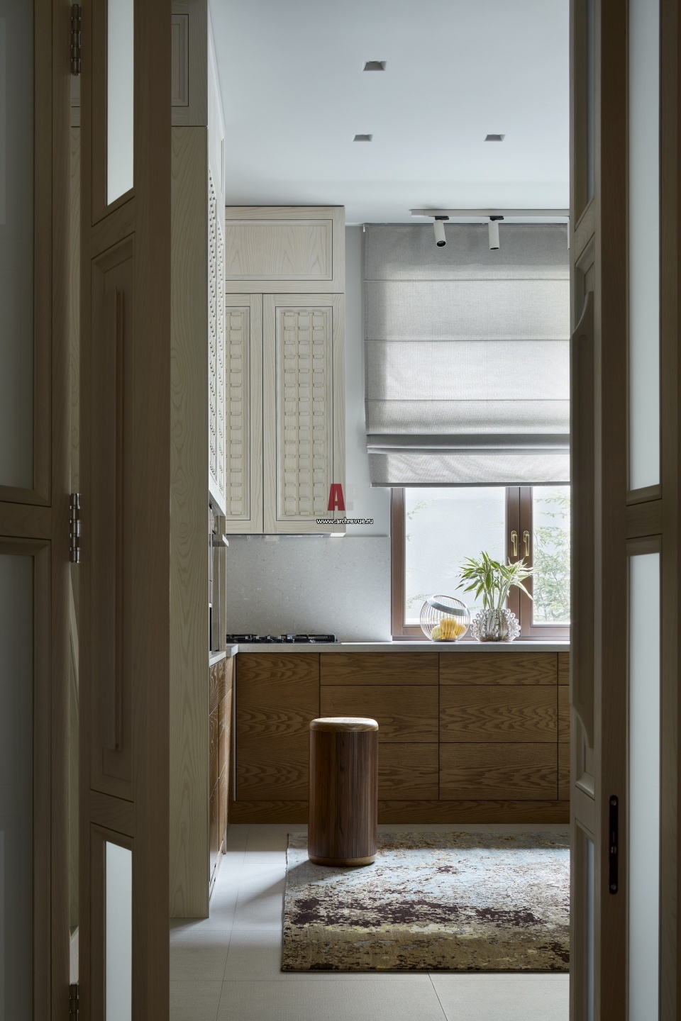 Первый этаж имеет анфиладную планировку. Гостиная, столовая и кухня выстроены по оси, движение в общей зоне организовано по кругу.