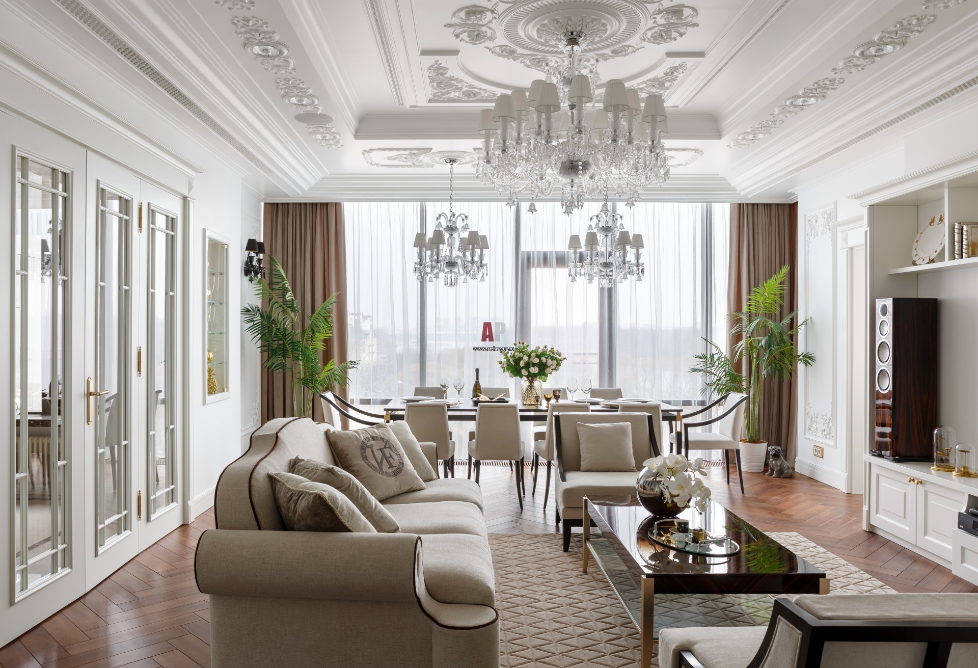 Интерьер гостиной выглядит легким, светлым и воздушным в духе апартаментов Нью-Йорка. Потолок в украшен ажурным лепным орнаментом, выполненным по авторскому дизайну. Хрустальные люстры с колокольчиками, Schonbek. Диван, Visionnaire. Кресла, Selva.