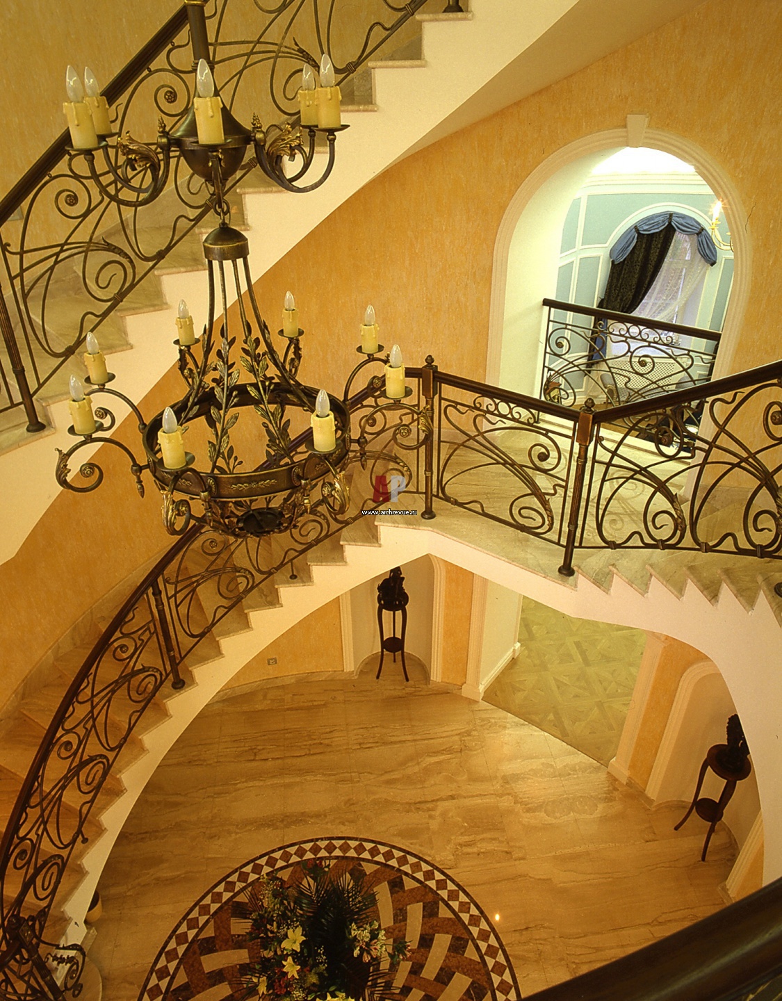 Лестничный холл. Винтовая лестница украшена кованым ограждением с цветочным орнаментом. Ажурный металлический декор покрыт патиной.