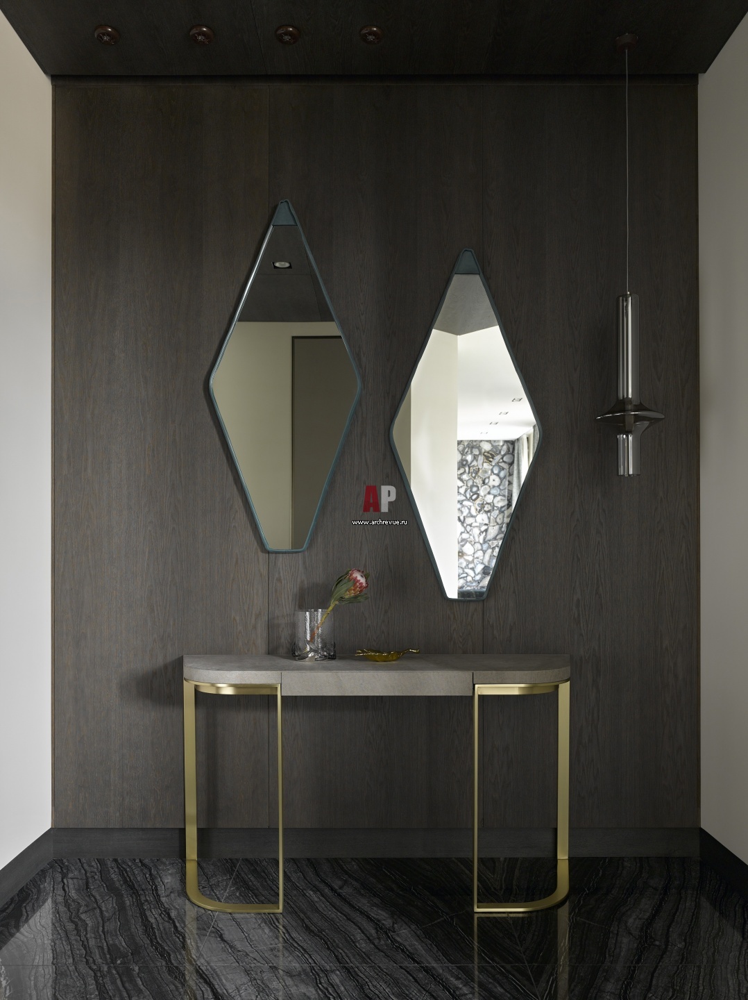 Прихожая. Деревянные панели, тонированный дуб, матовый лак, на заказ, изготовление «Ассоциация русских мастеров». Консоль из латуни, Baxter. Зеркало, Arketipo.