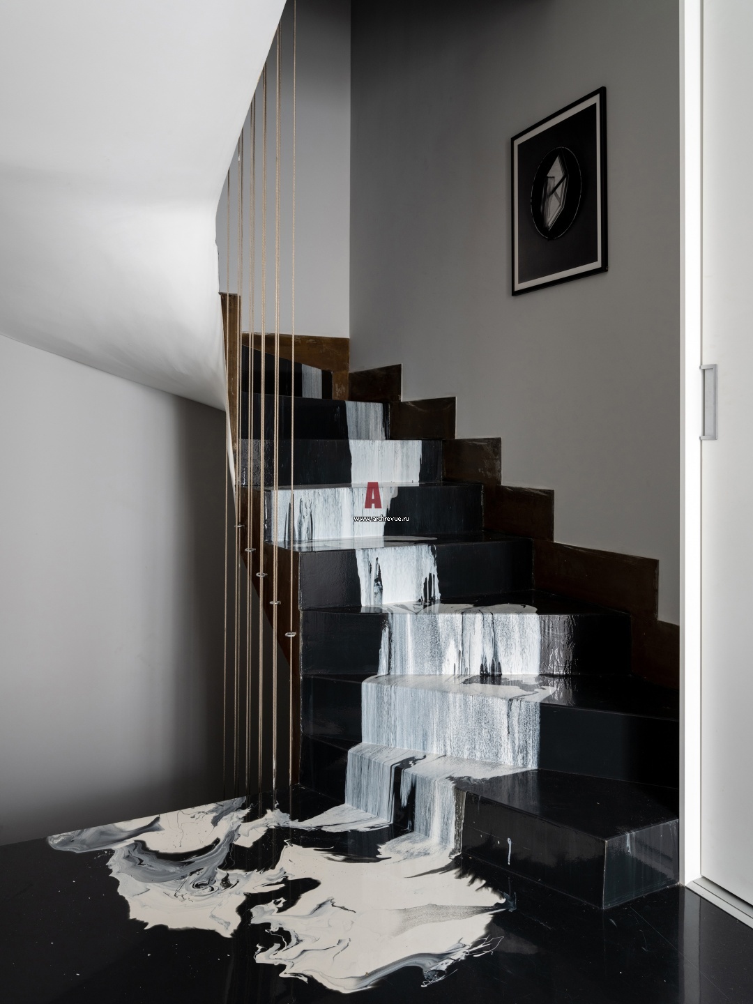 Ступени второй лестницы выполнены из эпоксидной смолы, напоминающей жидкий мрамор. Ограждение в виде металлических тросов.