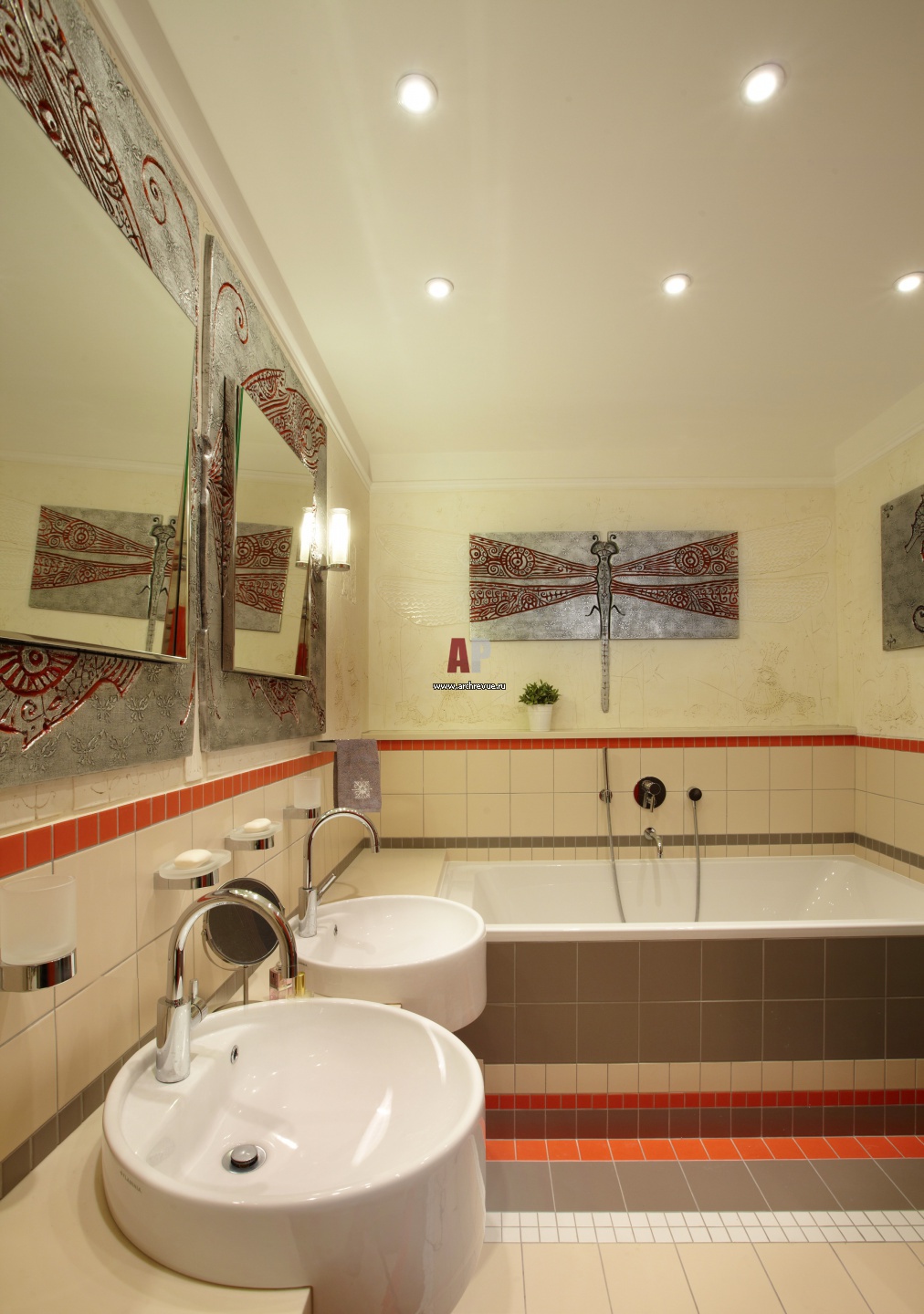 Ванная комната с красной плиткой в отделке. Керамическая плитка трех разных цветов, Ceramica Vogue. Ванна,Villeroy & Boch. На стене – роспись «Стрекоза». Роспись стен, художник Александр Резвяков.