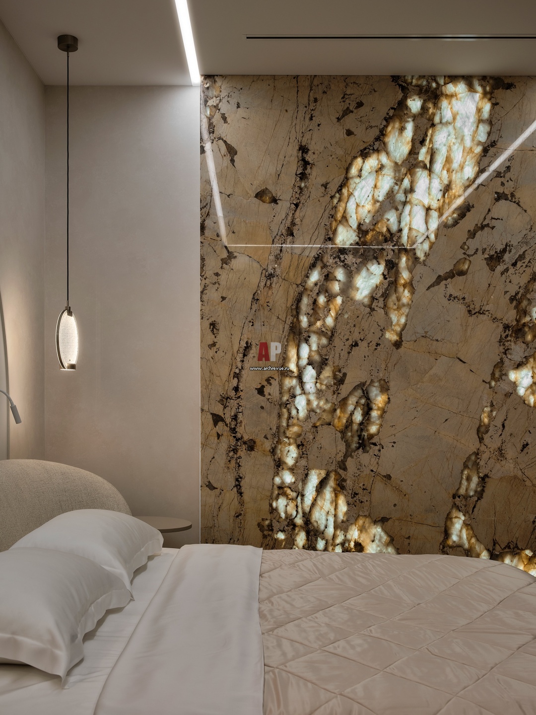 Камерное настроение в спальне создает встроенная подсветка панно из слэба мрамора Patagonia. Подсветка для камня закреплена на двух вертикальных мебельных полотнах, которые можно выдвигать, когда требуется обслуживание световой ленты.