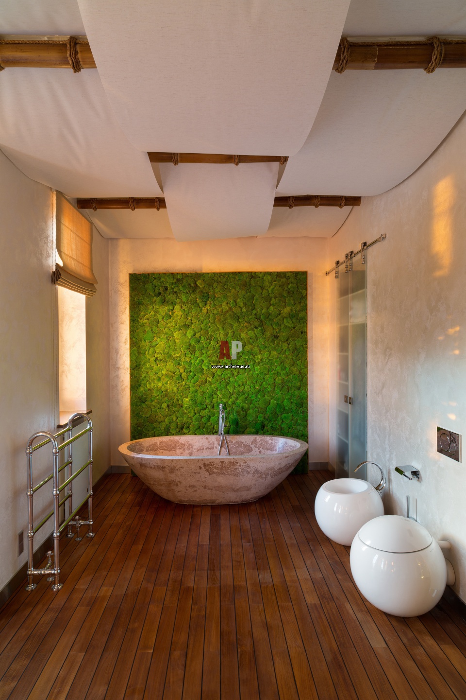 Все помещения второго этажа сделаны просторными. Площадь хозяйской ванной комнаты составляет 40 кв. метров. Стены отделаны декоративными финишами под травертин. Каменная ванна, Vitra. Стена за ней оформлена стабилизованным мхом.