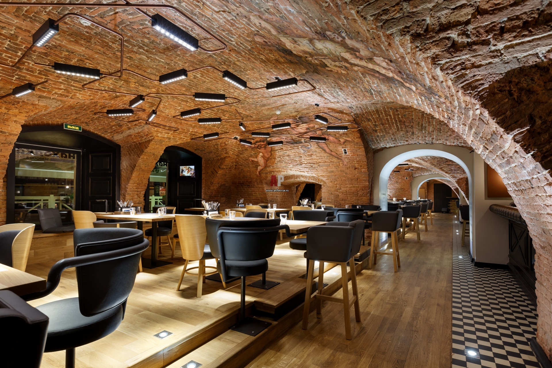 Мощный визуальный акцент интерьера – единый потолочный светильник геометрически сложной формы. Он собран из нескольких диодных ламп и освещает все центральное помещение.