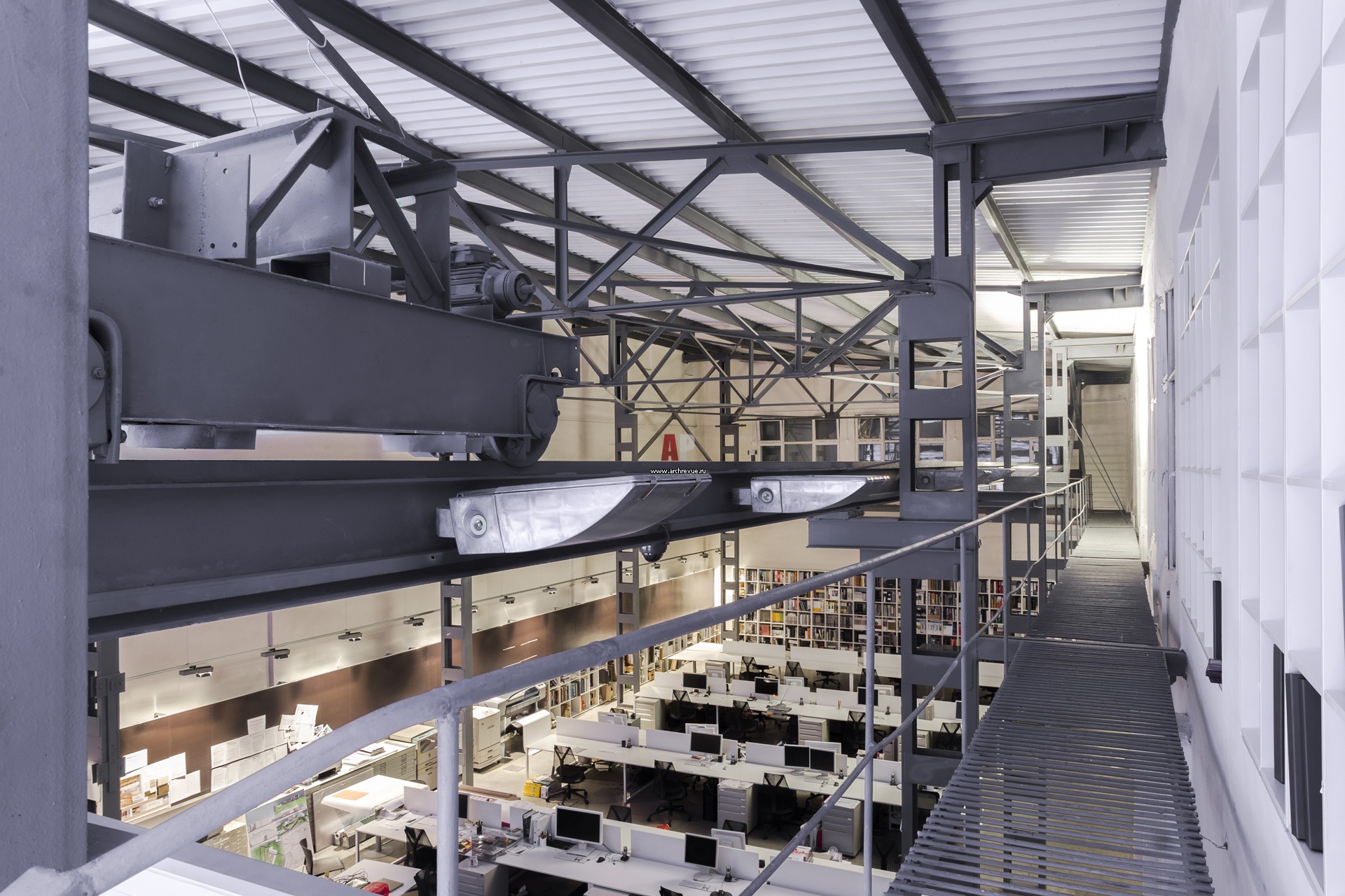 Вид с надстроенной антресоли на рабочий open-space. Металлические элементы придают пространству индустриальный вид.