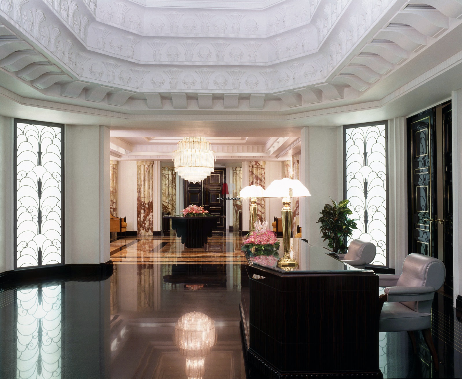 Интерьер приемной в стиле ар-деко. Украшение восьмигранного помещения – каскадный лепной потолок , а также витражи с ажурным металлическим орнаментом. Пол из черного глянцевого бельгийского мрамора без единой прожилки.