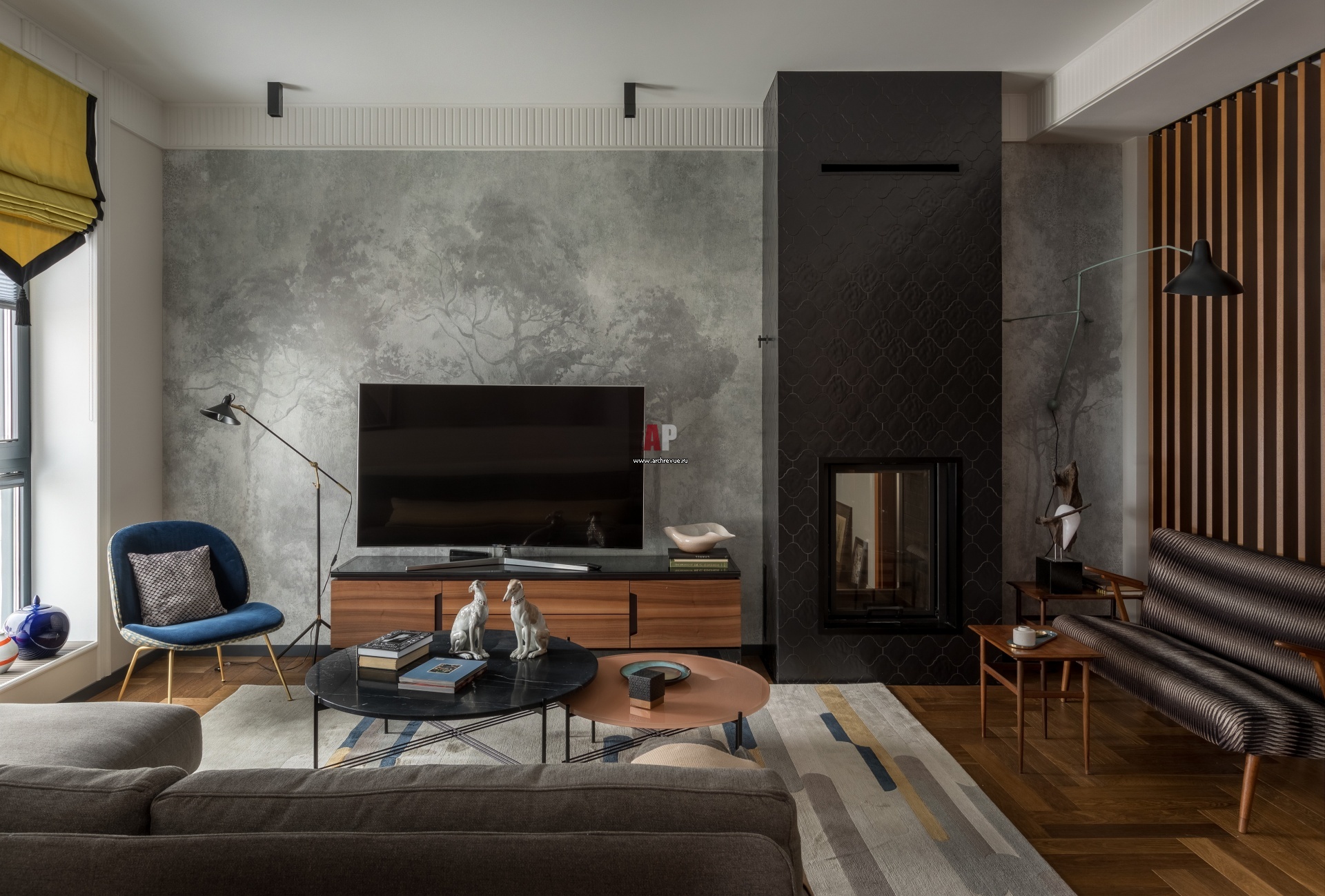 Стена в гостиной оформлена авторской росписью. Журнальный столик, Gubi. Кресло, Gubi, модель Beetle. На окнах – желто-золотые римские шторы.