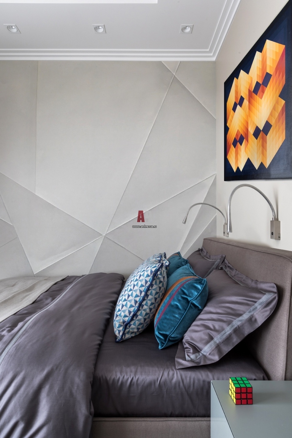 Интерьер детской. Стена за кроватью зашита тканевыми панелями с геометрическим рисунком.
