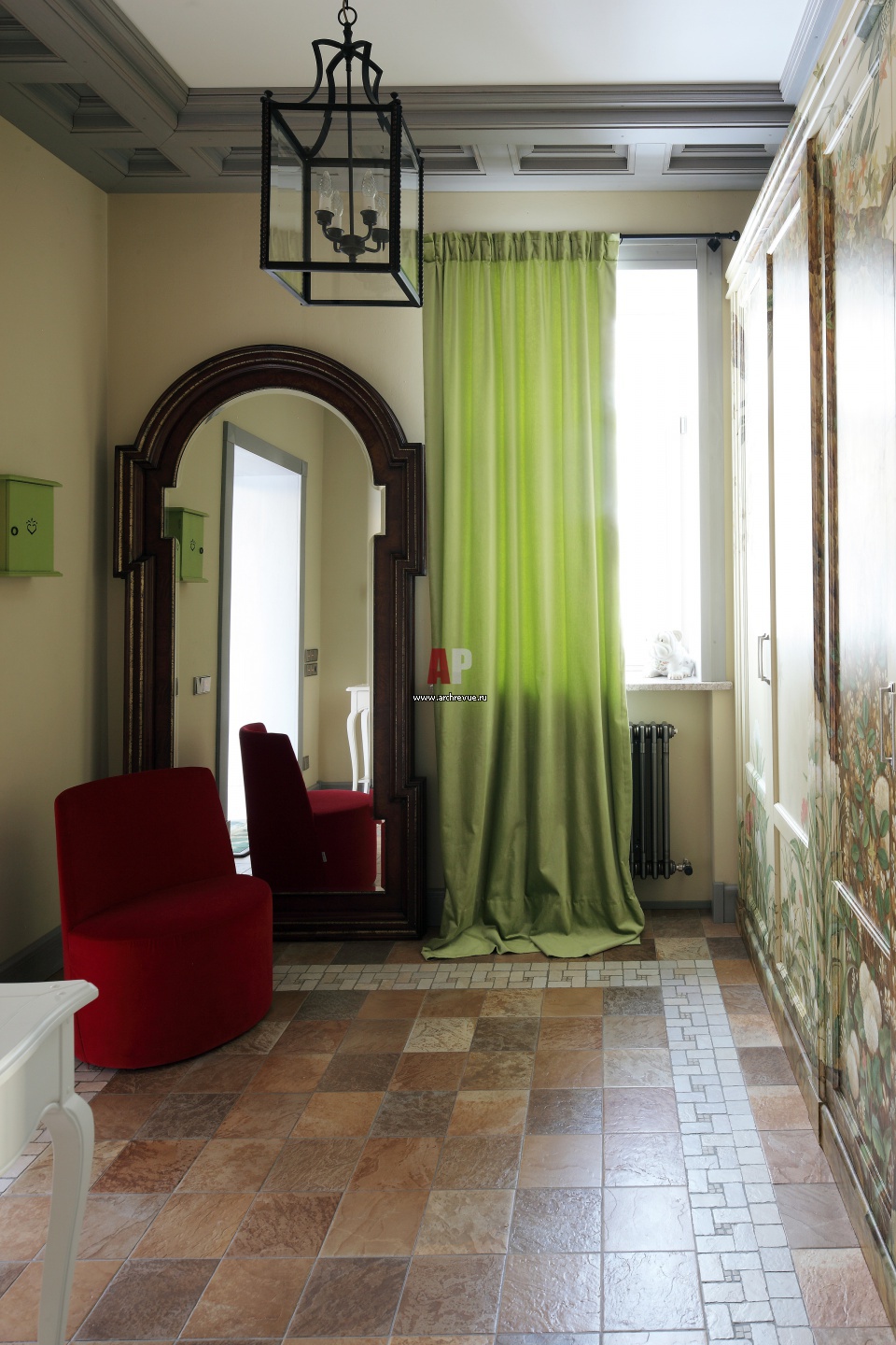 Интерьер прихожей. На полу – плитка, Casa Dolce Casa. Красное кресло, Casamilano. Шкаф сделан по чертежам архитектора из лиственницы и дуба с многоэтапной покраской и росписью работы художника Ольги Муратовой.