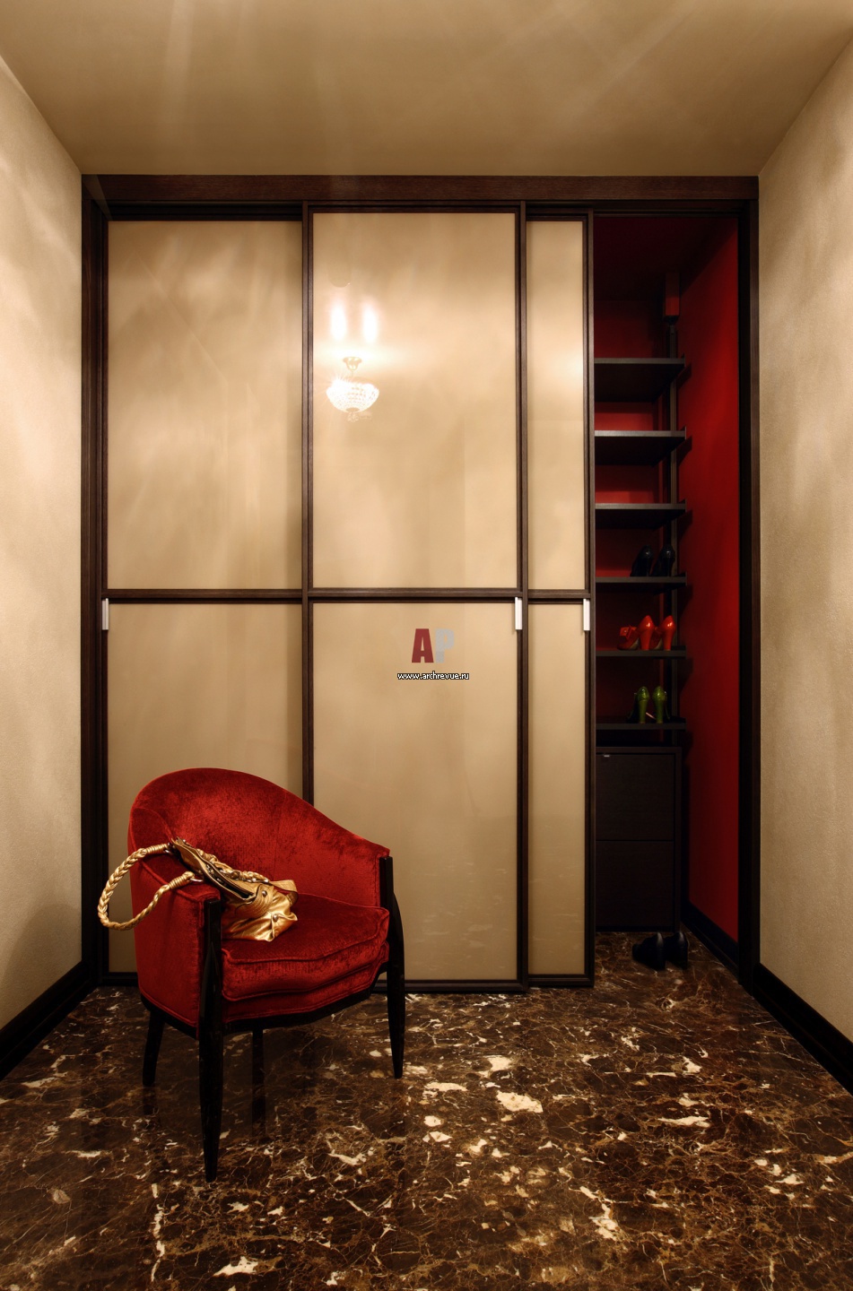 Прихожая в стиле фьюжн. Встроенный шкаф Longhi, кресло Eve. На полу – мрамор сорта «Имперадор Дарк».