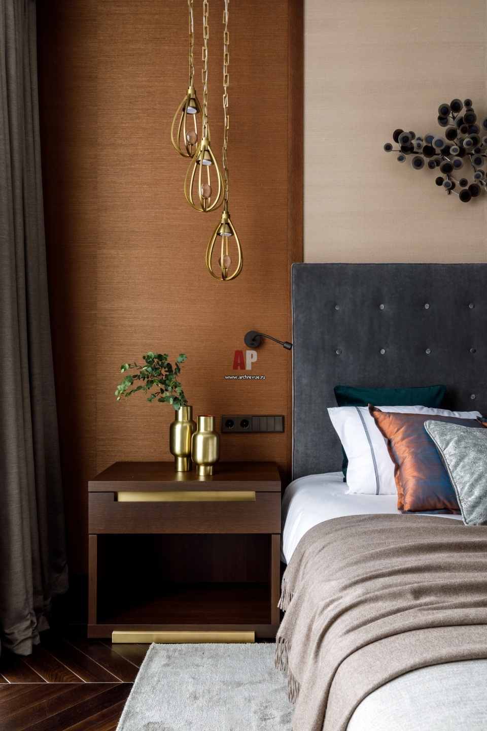 Хозяйская спальня оформлена в теплых терракотовых тонах. Обои выполнены из натуральных высушенных водорослей.