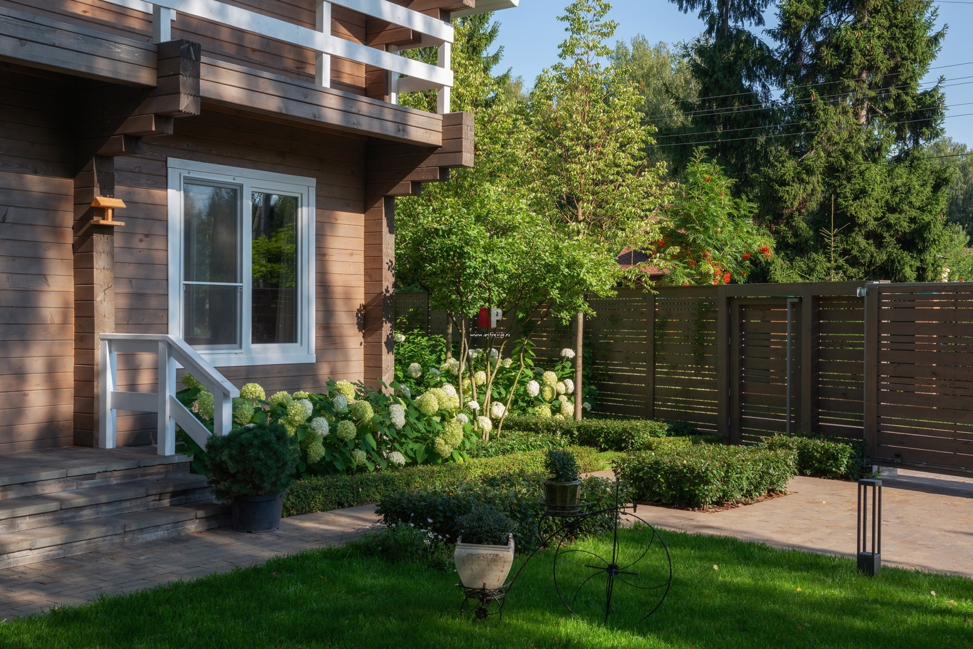 Ограждение территории имеет оригинальный дизайн. Доски разной ширины чередуются между собой с одинаковым шагом. В этом же стиле выполнена дровница.