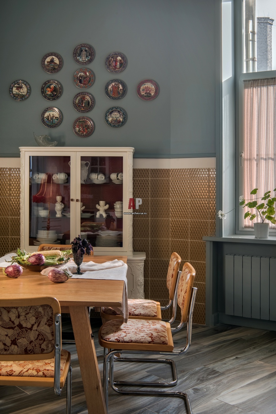 Кухня. Стулья, Cesca chair, винтаж. На полках стеклянной витрины – винтажный фарфор.