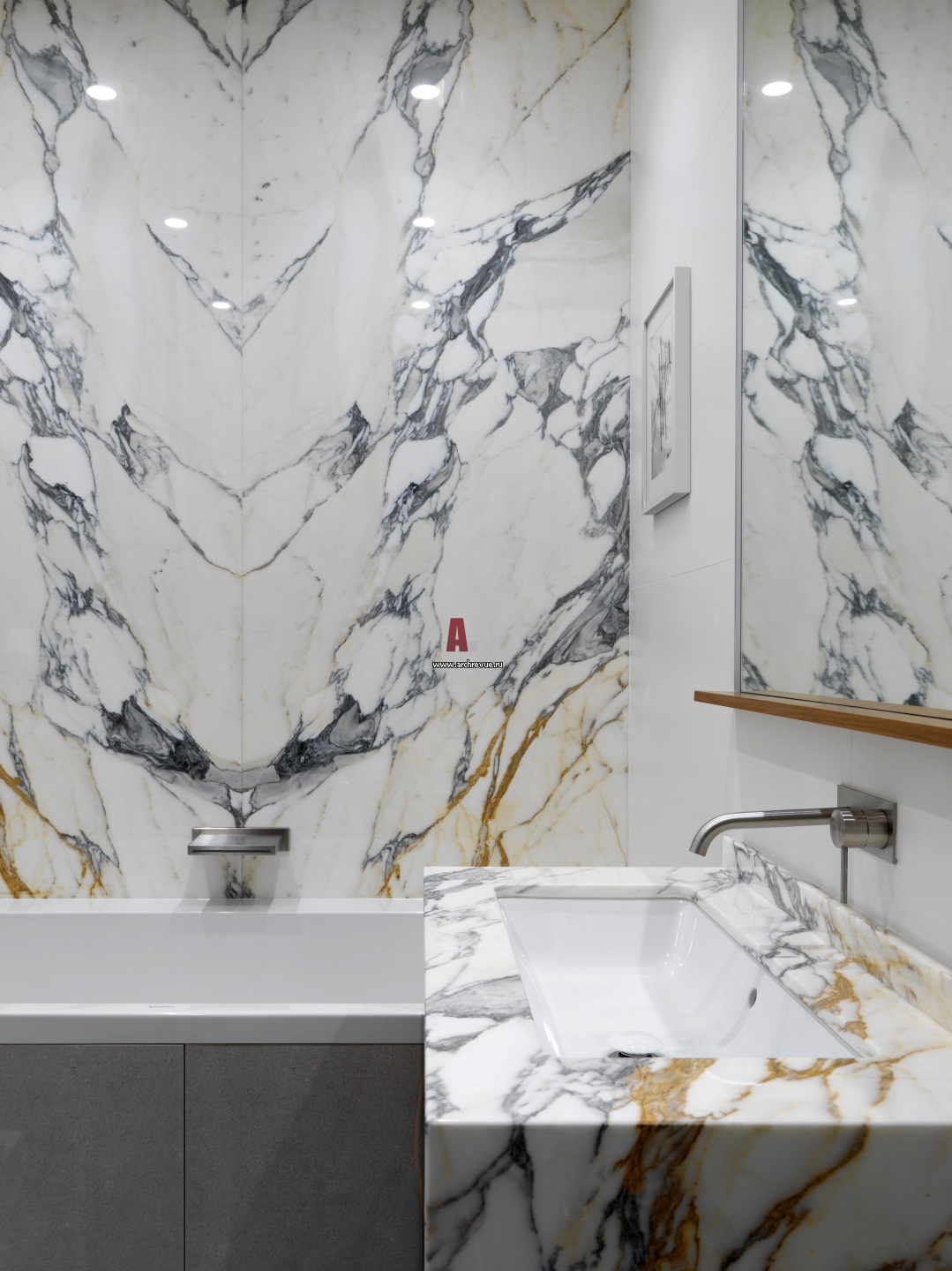 Ванная при хозяйской спальне. На стенах и на столешнице умывальника – мрамор Calacatta. Сантехника, Duravit. Смесители, Gessi.