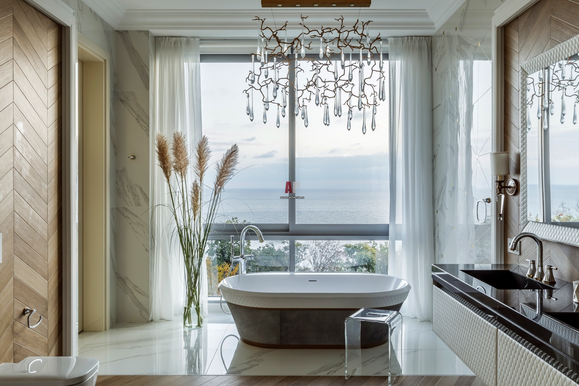 Хозяйская ванная комната. В оформлении использовано два вида керамогранита: холодного оттенка под мрамор и с теплой текстурой под дерево. Акцент сделан на отдельно стоящую у окна ванну Falper. На стене здесь – панно из геометрических секций с золотыми круглыми вставками. Люстра, Serip.