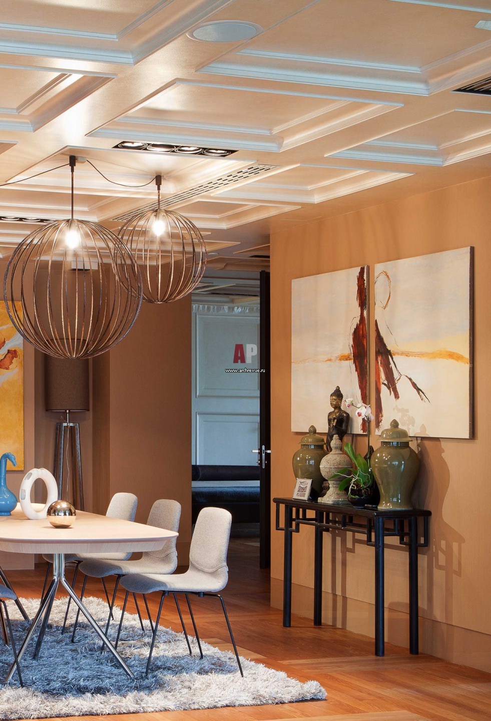 Обеденная группа акцентирована светильниками в виде шаров из металла. Важную роль в декоре помещений играют живописные картины. Они выполнены в абстрактной манере и теплой золотисто-песочной цветовой гамме.
