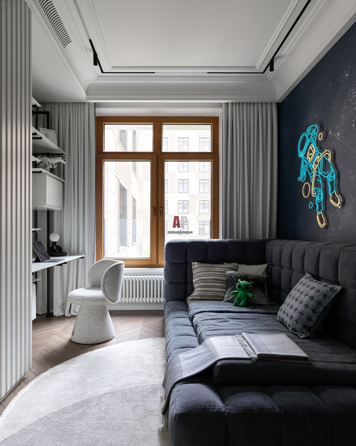 Спальня мальчика оформлено в синей гамме. Кровать и шкафы изготовлены на заказ по индивидуальным эскизам дизайнера. На стене – покрытие «звездное небо». На нем – световое панно-космонавт также на заказ.