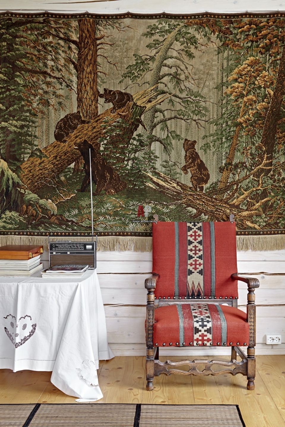 Ковер с репродукцией картины «Утро в сосновом лесу» был куплен случайно, но идеально зарифмовался с обивкой красного антикварного кресла.