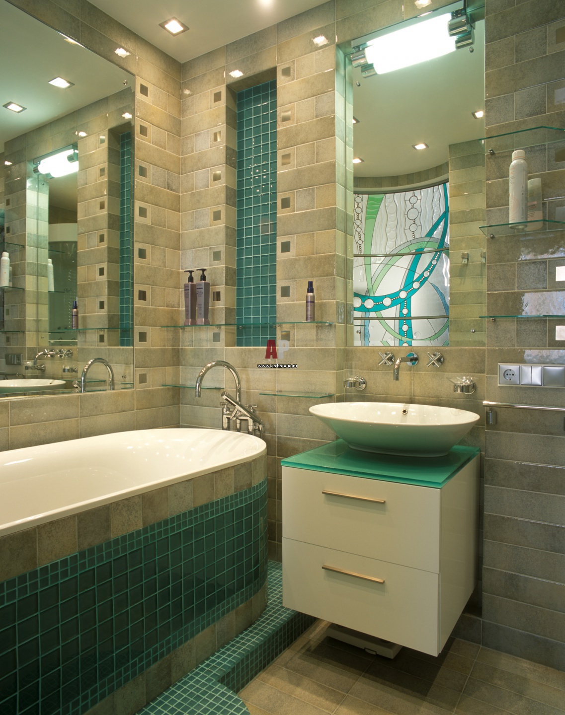 Хозяйский санузел в зелено-бежевой цветовой гамме. Керамическая плитка, поставщик «Конвент-Центр», покрыта глазурью. Одна из стен – полукруглый художественный витраж.