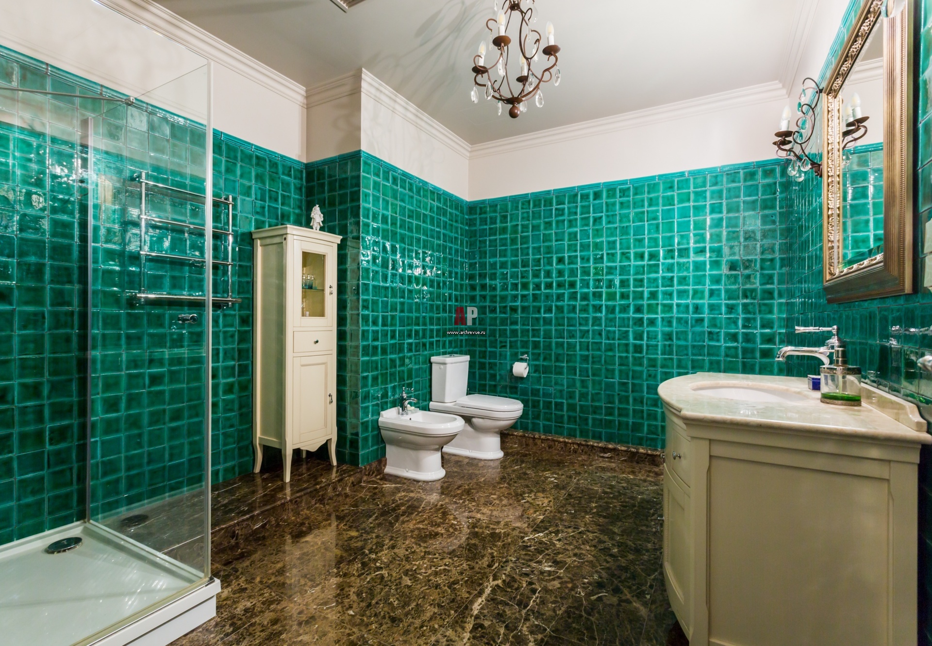 Стены ванной комнаты облицованы плиткой ALTERET, 10Х10, Verde Pastel насыщенного бирюзового цвета. Сверху керамическай молдинг. Плитка, поставщик «Грета Вульф».
