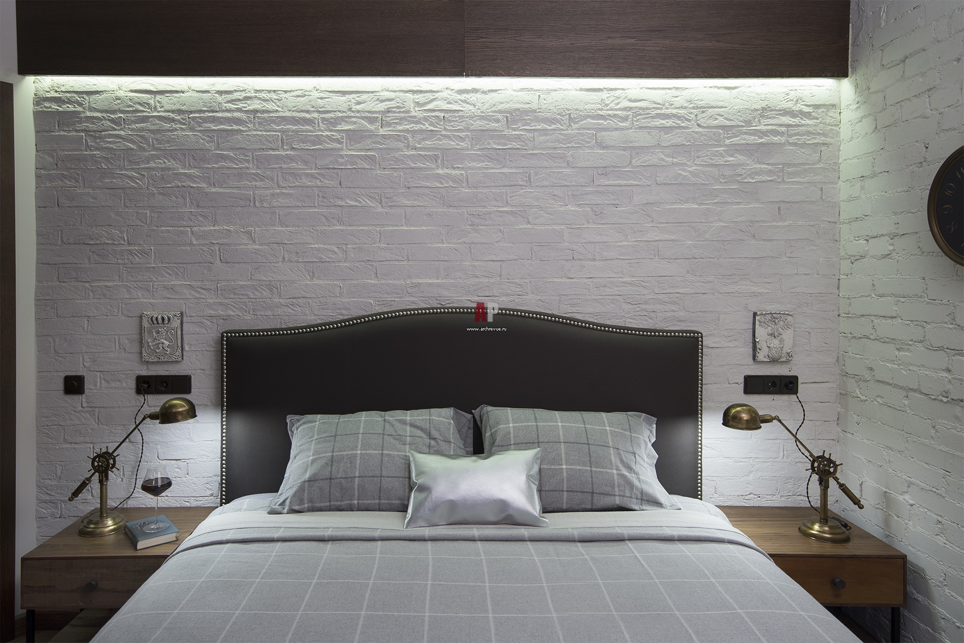 Фото интерьера спальни небольшой квартиры в стиле лофт. Карниз над изголовьем кровати выполнен из тонированного под орех дуба и оснащен подсветкой.