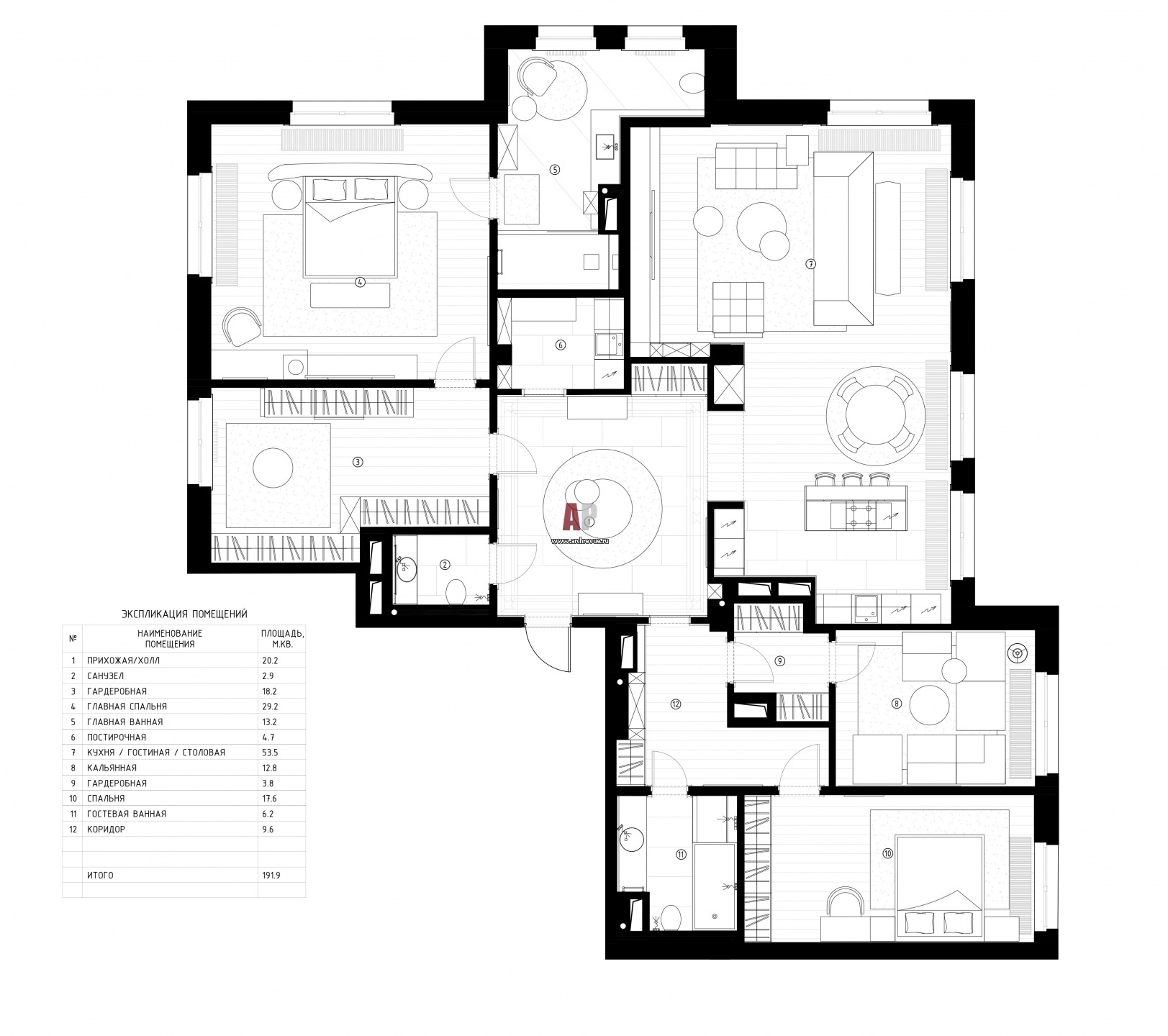 Планировка большой квартиры в ЖК «Привилегия», Санкт-Петербург. Общая площадь – 190 кв. м.