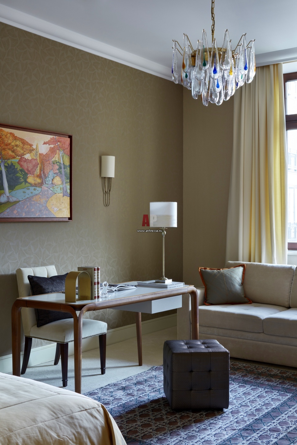 Интерьер кабинета с дополнительным спальным местом для гостей. Стол, Porada. Стул, Fratelli Barri. Люстра, La Murrina, модель Pierrot.