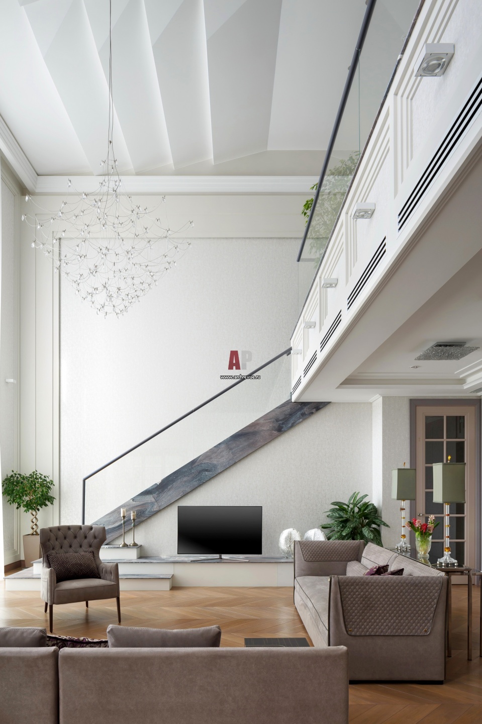 Стены в гостиной на всю высоту оформлены белыми обоями с имитацией штукатурки. Ограждение лестницы и балкона выполнено из стекла. Динамику вносит темно-серый камень в отделке камина и ступеней лестницы, а также сложная пластика потолка.