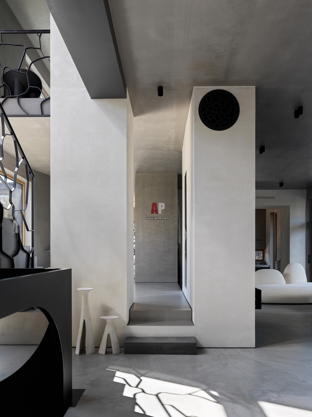 Артистичный бетонный интерьер трехэтажного дома в современном стиле