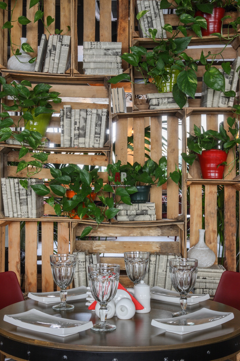 Фото интерьера зала кафе в стиле фьюжн. Стеллаж из ящиков работает на просвет, многочисленные цветы в керамических горшках оживляют городской интерьер.