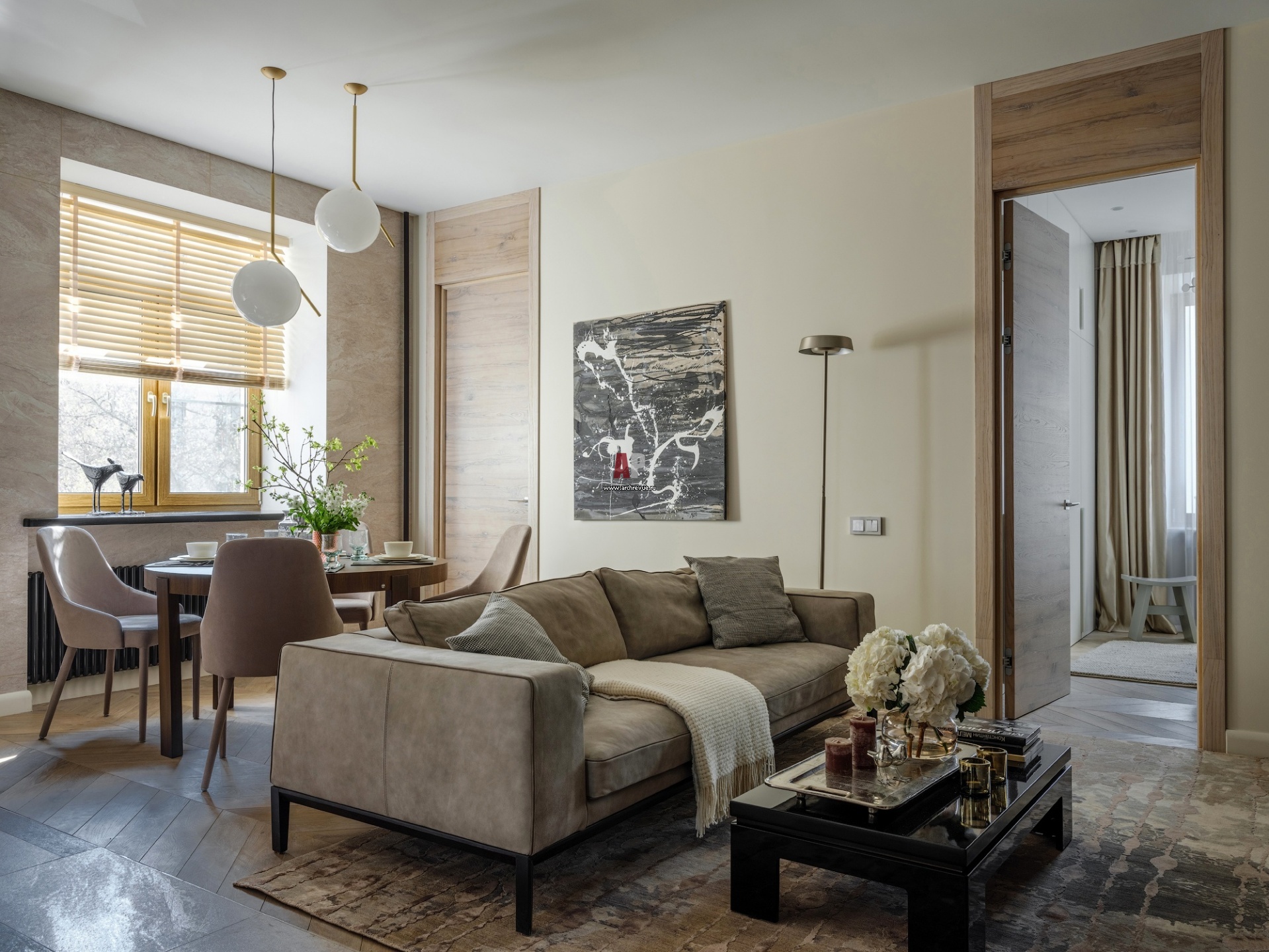 Общая гостиная 36 кв. м. Из нее организованы выходы в спальню и кабинет. Визуально высоту потолка увеличивают деревянные двери с панелями-фрамугами. Диван, Operae Home, модель Orfeo. Журнальный столик, встроенная мебель, на заказ, по эскизам дизайнеров.