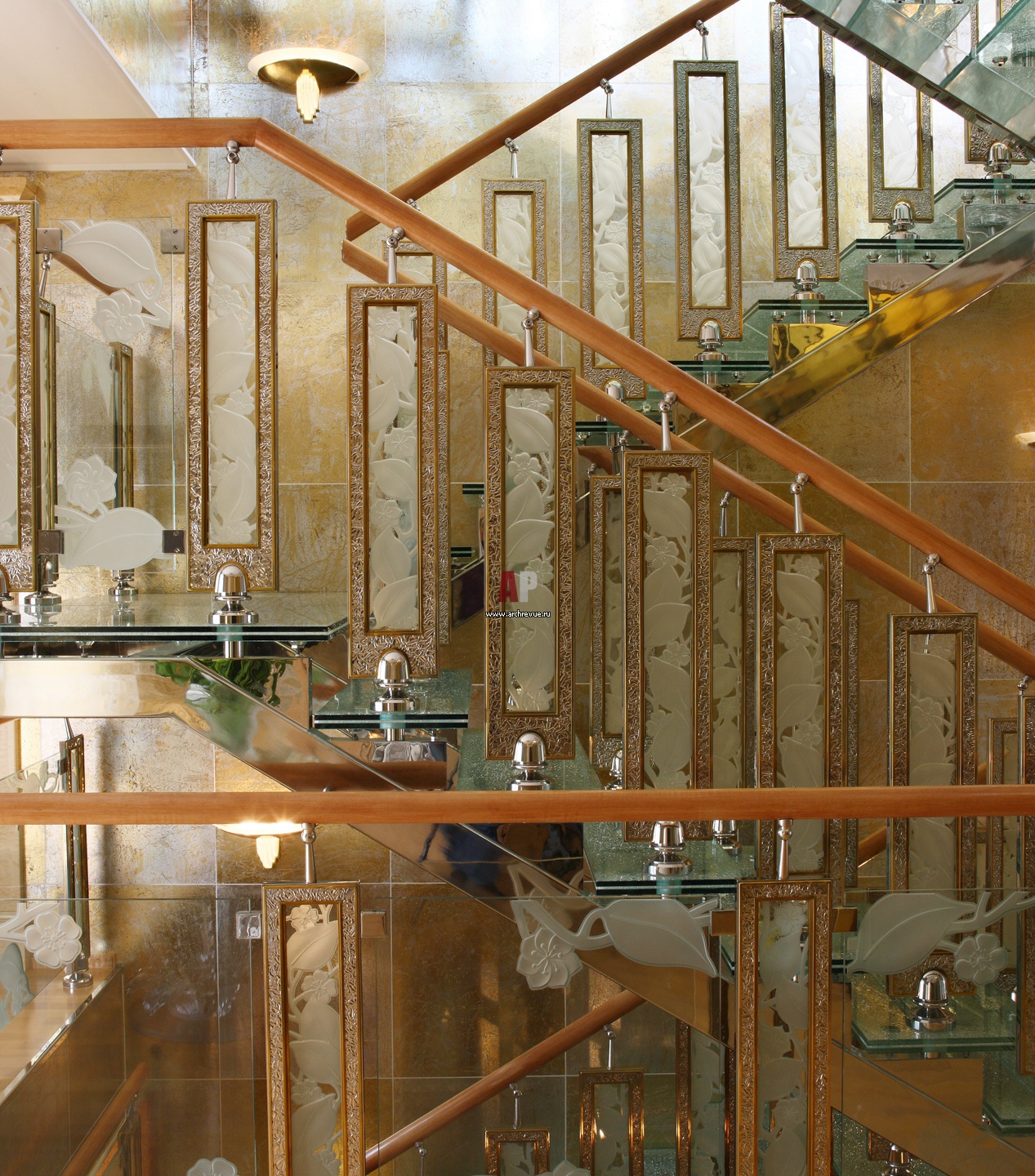 Лестницы в стиле ар-деко. Каждая из 90 балясин – произведение искусства. В центре балясины – стекло с выгравированным рисунком цветков и листьев сакуры. Оно вставлено в раму из латуни и нержавейки с эффектом мятого металла.