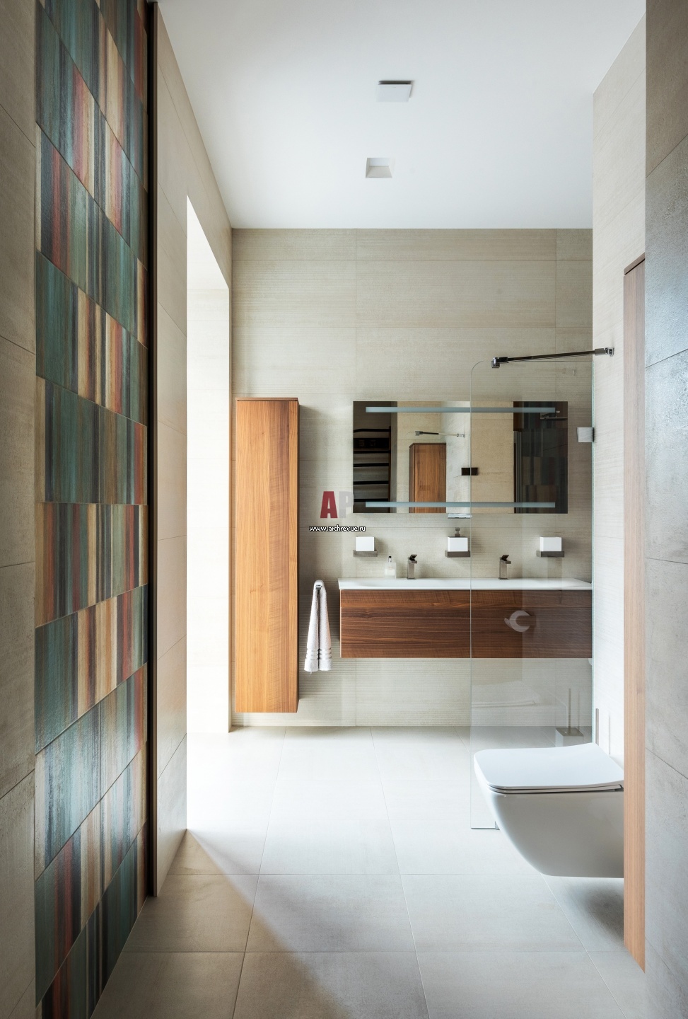 Площадь хозяйского санузла более 20 кв. м. Помещение отделано керамогранитом с фактурой камня. Современная мебель с деревянными фасадами.