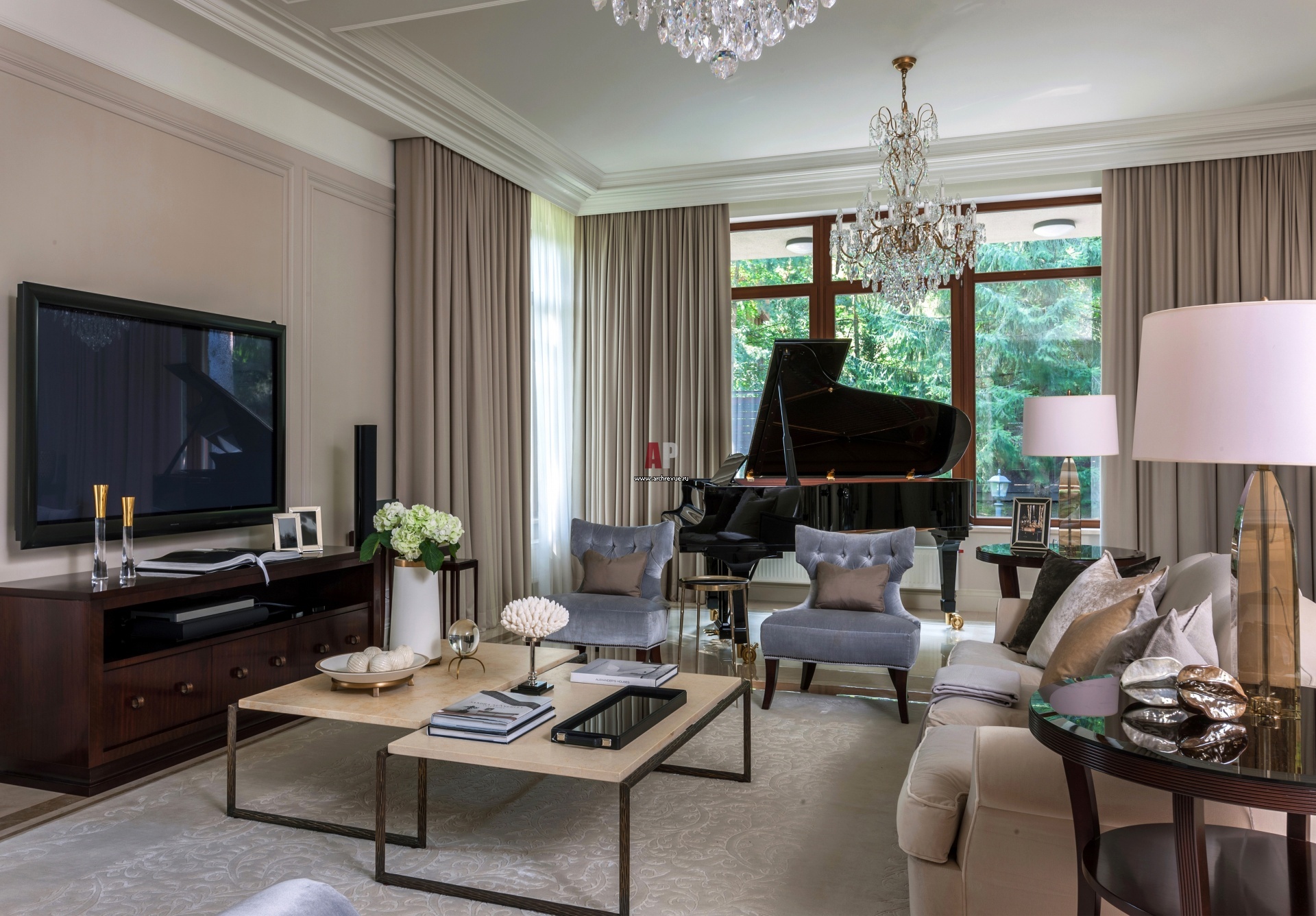 Дом имеет современную архитектуру с перетекающими помещениями, открытыми пространствами и панорамными окнами. Она стала базой для создания комфортного американского интерьера.