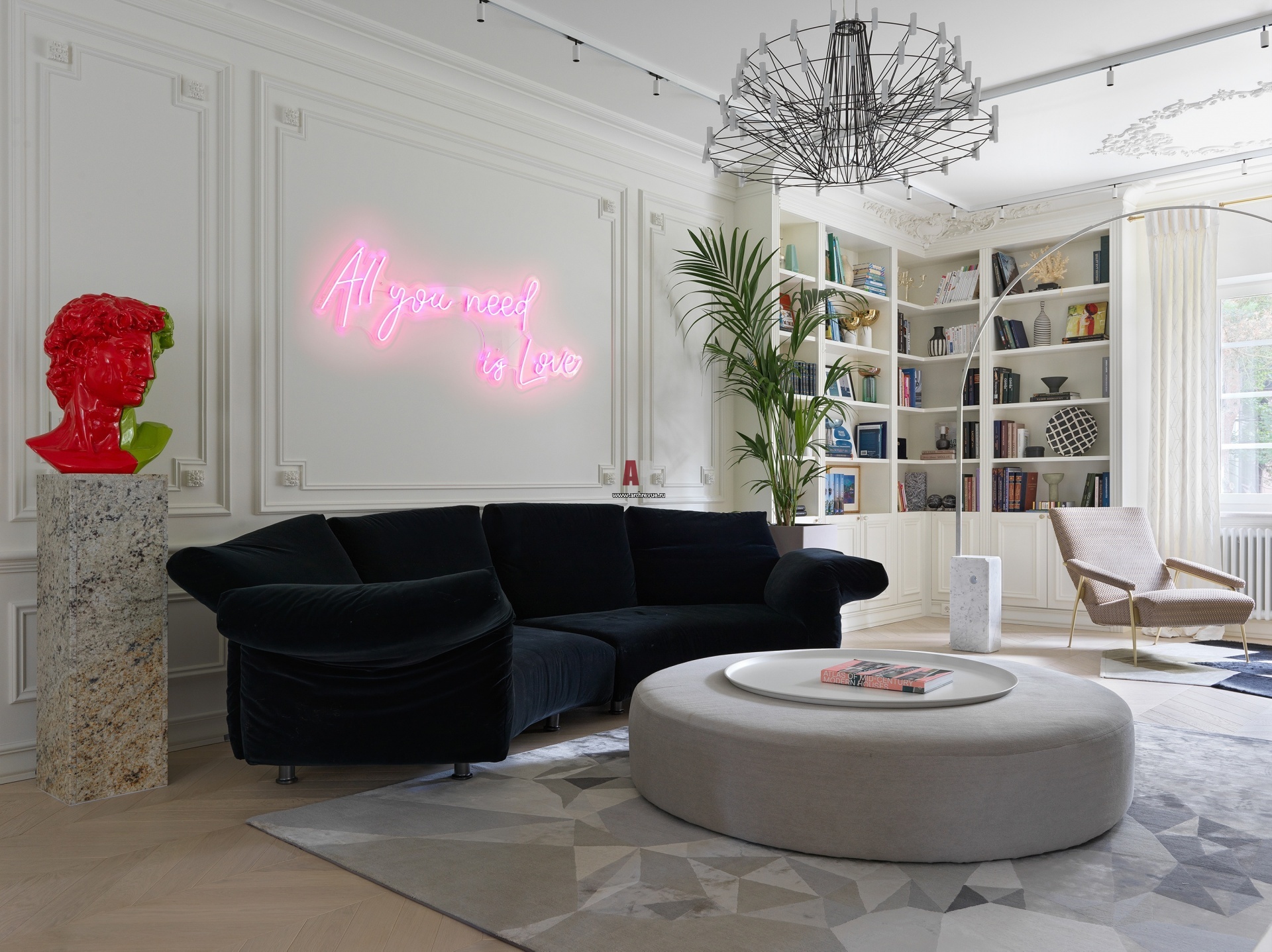 За диваном в гостиной – неоновая надпись из песни The Beatles All we need is love. Скульптура Давида тоже аллегорична: с помощью цвета Давид разделен на две половины – мужскую и женскую.