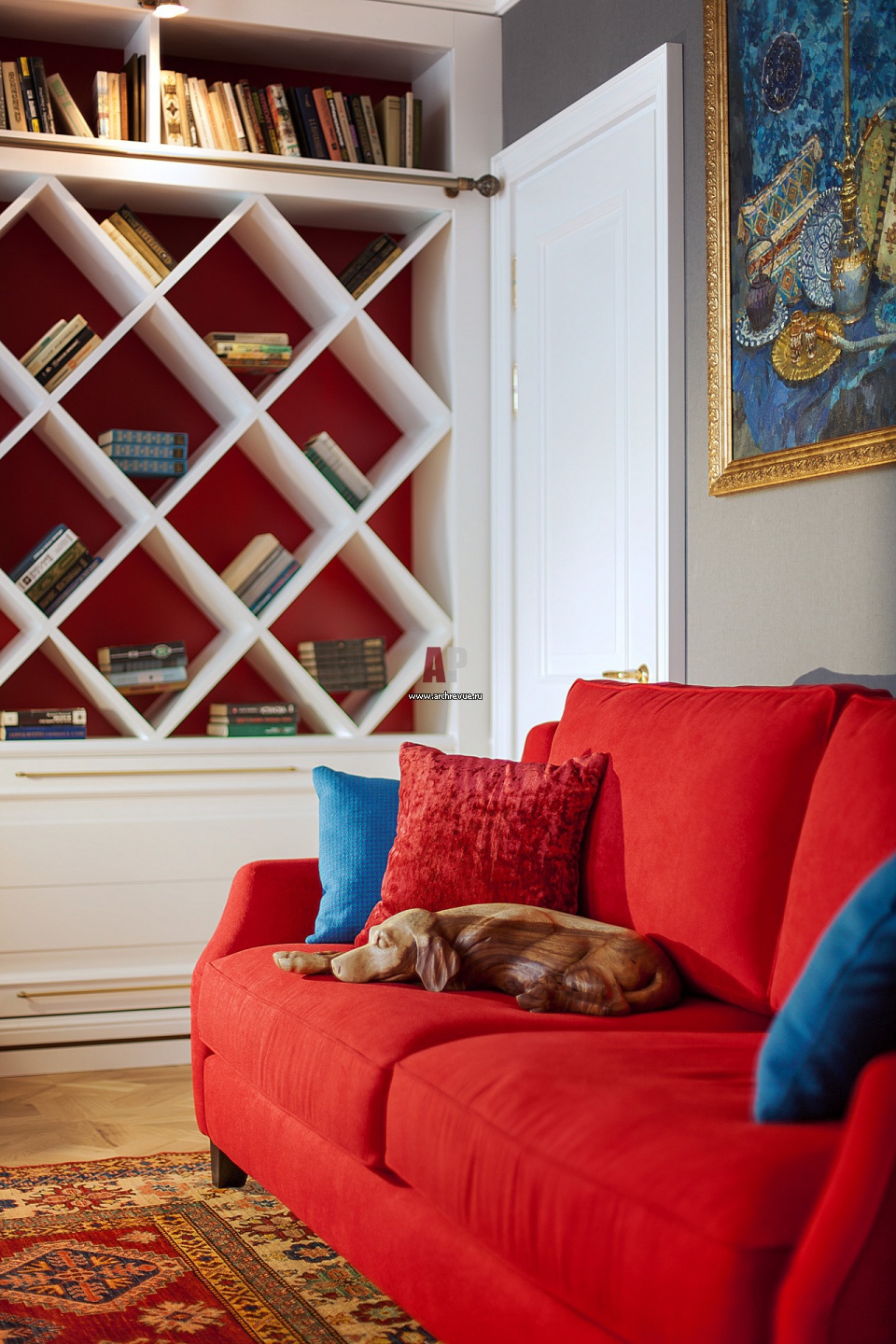На фото – мягкая зона в кабинете. Брусничный задник стеллажа гармонирует с обивкой дивана.