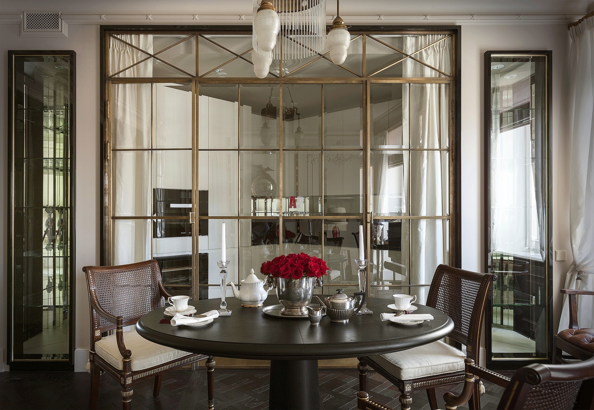 Кухню от гостиной-столовой отделяет авторская латунная перегородка с прозрачными витражами. Люстра и дверные ручки антикварные. Обеденный стол по дизайну Марины Филипповой. Стулья, Baker.