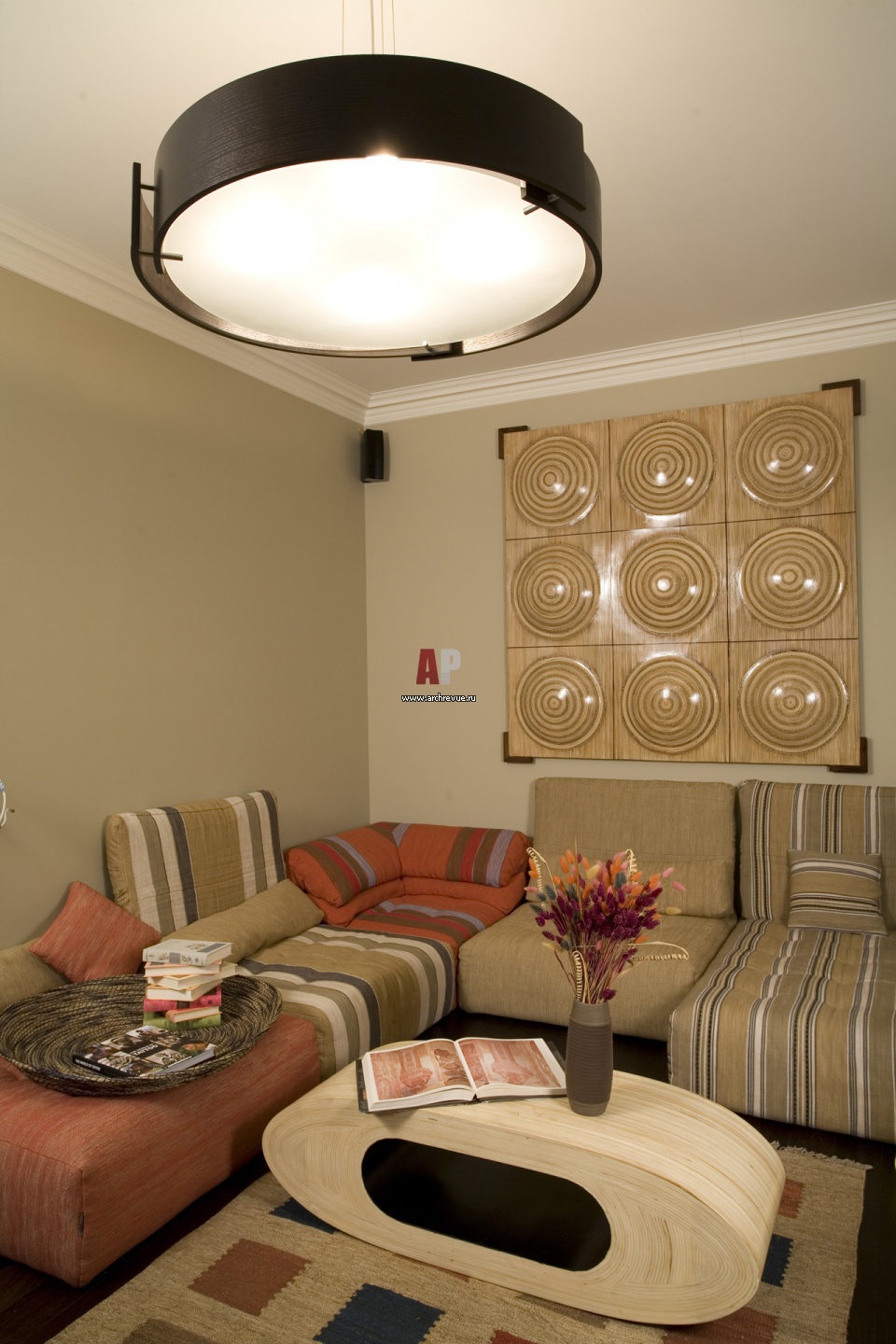 Кабинет выполняет роль гостевой комнаты и лаунжа. Он оформлен в этническом стиле. Панно из светлого дерева привезли с острова Бали. Низкий угловой диван набран из деталей разных форм цветов.