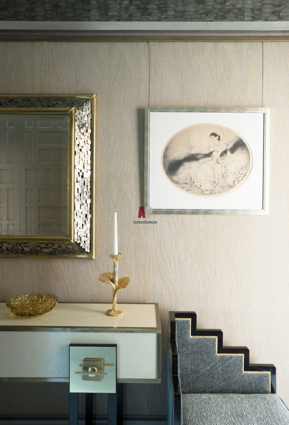 Туалетный столик в гардеробной сделан на заказ. Стены затянуты натуральным шелком.